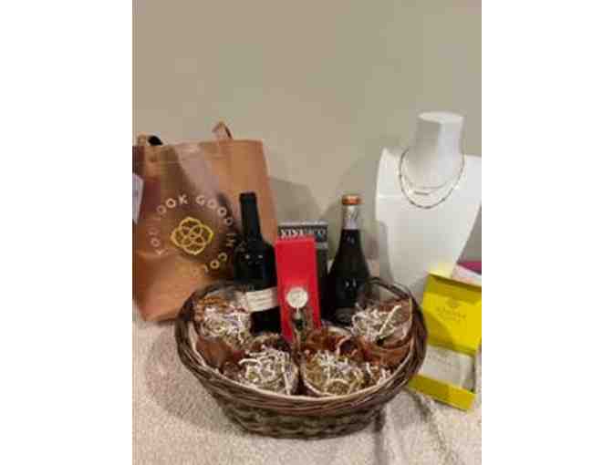 Swoon her with this delightful duo - a gorgeous necklace and wine basket featuring the coveted Simi Landslide Vineyard Cabernet Sauvignon, Vincent & Sophi Morey Bourgogno Chardonnay, 4 gorgeous wine glasses, wine stopper, wine chiller and wine aerator