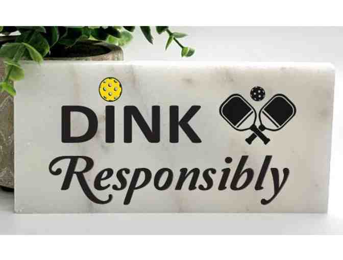 PICKLEBALL GIFT STONE PLAQUE - MARBLE SIGN - "DINK Responsibly" - Fun gift for your Pickleball playing friends - Looks great on a bar or countertop. Stand included. Measures 4” x 8” and weighs about 1.4 lbs