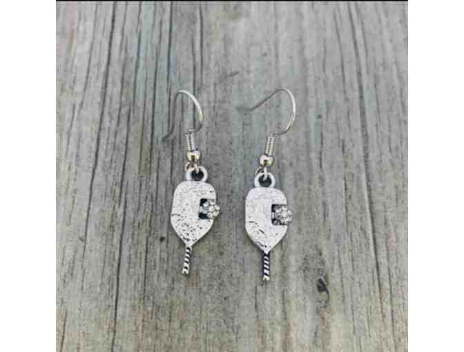 Silver-plated pickleball earrings are 20mm x 10mm.