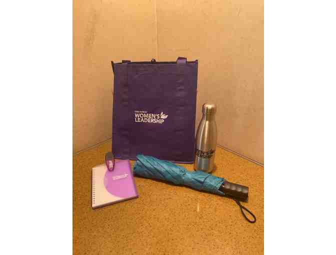 Women's Leadership branded reusable bag, watter bottle, note pad, clip, and umberalla!