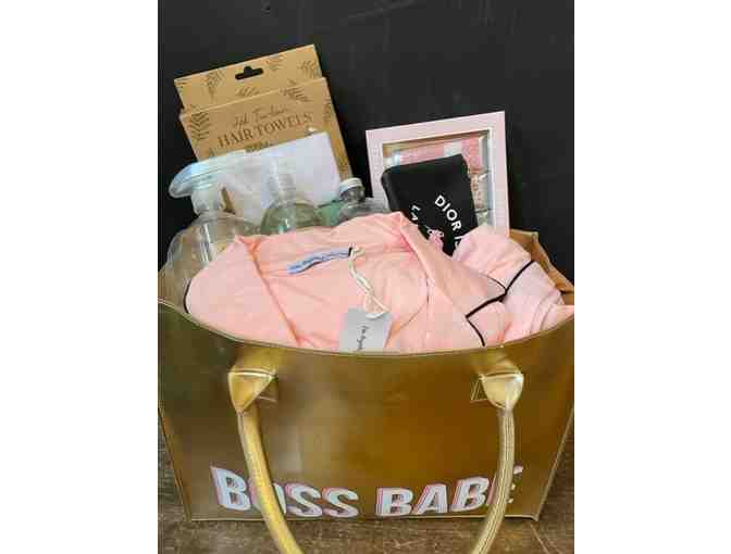 This pamper package includes a Gold Boss Babe travel bag, 2 hair towels, soft women's pink pajamas (m/l), hand soap, bath soap, linen water and a cute cosmetic pouch.