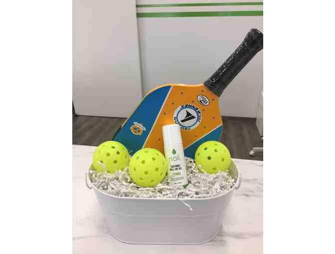 This basket contains 2 pickle ball raquets, 3 balls and roll on pain relief gel