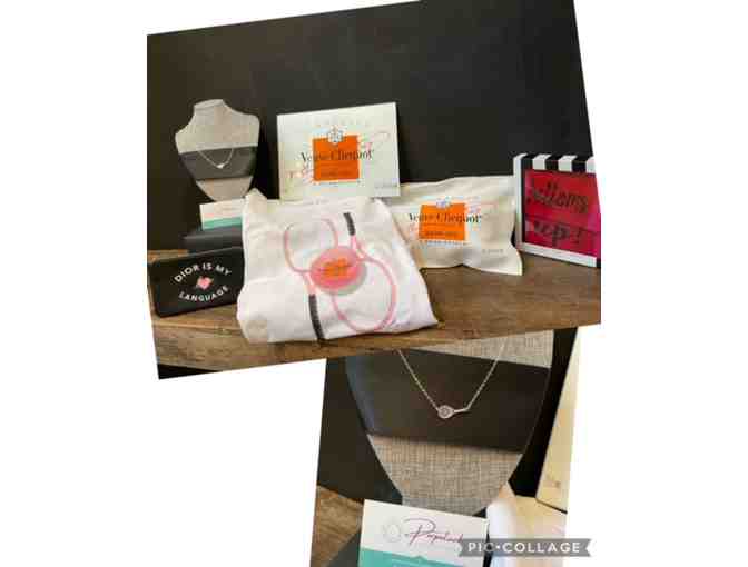 This tennis basket includes a Sterling Silver Tennis Raquet necklace from Perpetual Jewelry Design that can be worn as a 16" or 18" bundled with a cute T-shirt, a large make-up pouch with a small make-up bag, bottoms up socks and a glass trivet/tray.