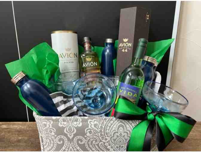 This basket has everything you need (except the blender & ice) to have a margarita bash! It includes Avion Silver 750ml, Del Maguey Vida 750ml, Avion Reserva 44, Avion Reposado small, Batch Highlands Agave 750ml and 4 stainless steel tumblers!