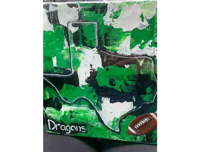 A painting by Gayle Bunch, an artist and retired Carroll ISD art teacher. This painting in Carroll colors is painted with a palette knife and thick acrylic paint. She adds a sports icon in the corner of the paintings of the client's choice. Also, these paintings can be done in college colors with the college's logo attached in the corner.