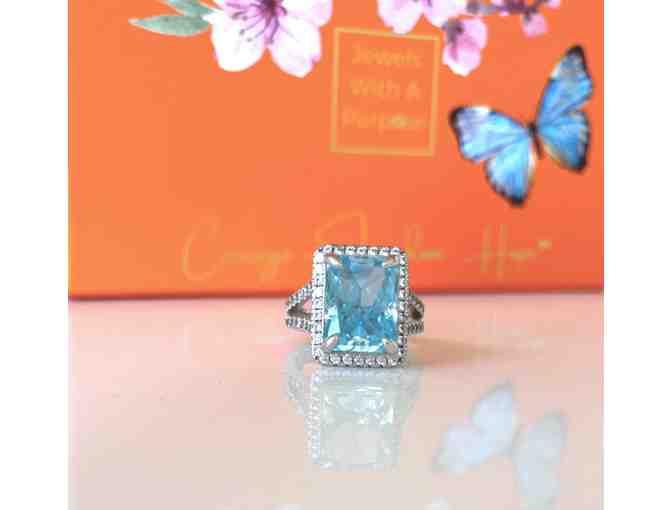Bold yet timeless, this exquisite cocktail ring is a head-turner and makes the perfect travel accessory! Beautifully designed in California and finely crafted in Europe, in solid 925 sterling silver with gold overlay and the world’s most desirable simulated diamonds and aquamarine ever created, in a special ice cut shape, for infinite brilliance! Hypoallergenic. Size 7 fits most. Wear it on several fingers. Outstanding packaging for gifting or to hold your keepsakes. Created exclusively for the philanthropic community!