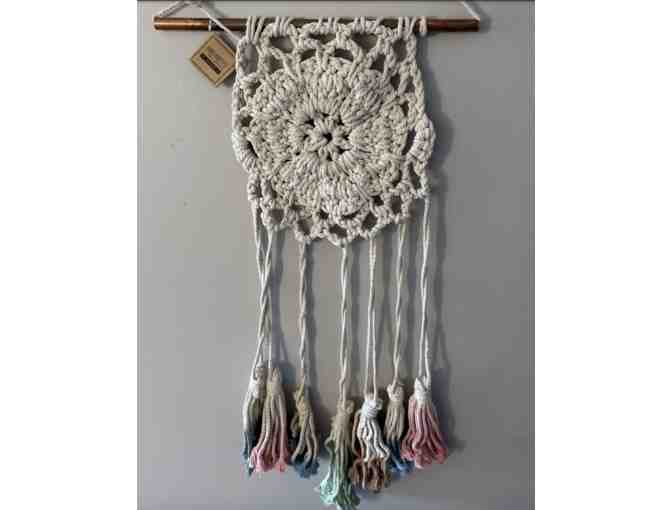 This wall art is dorned with stunning colorful macrame to brighten up your room.