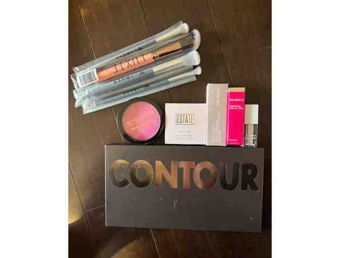 Package includes KAB Contour Palette, Revolution Matte Blush, Estate Just a Taste Mini Pigment Palette, Rose Inc Brow Renew, ModelCo Highlighting Shimmer Whip, Elf Liquid Glitter Eyeshadow, LA Ruce Makeup brushes and Luxie Makeup brush.