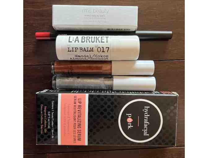 Package includes rms beauty tinted daily lip balm, LA Bruket Lip Balm No. 17, elf lip lacquers and Hydrafacial Lip Revitalizing Serum 0.47 fl. oz.