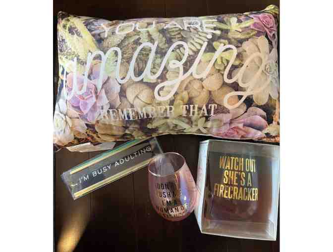 Just a little fun for the home. Package includes "You Are Amazing" throw pillow, desk plaque, "Don't Rush" wine glass and a "Watch Out" giant-sized wine glass that fits a full bottle of wine.