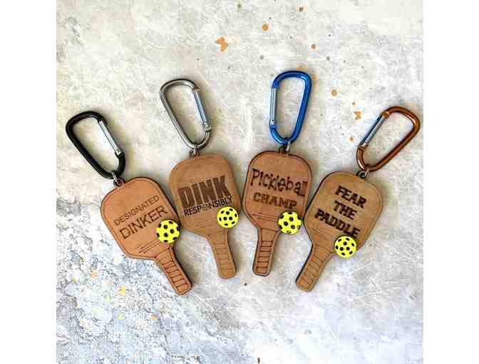 Laser cut and engraved from 1/4" maple plywood. Embellished with a 1/8" neon pickleball. Measures approximately 4" in length. Attach to your bag with a carabiner clip.