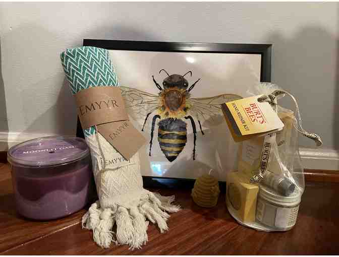 Bee watercolor handpainted by ACE parent, Laura Schweitzer, Burt's Bee's products, candles and tea towel
