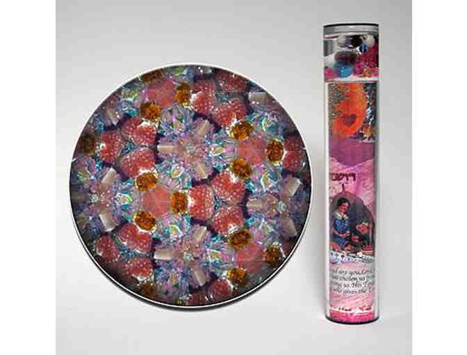 'Bat Mitzvah' by Carolyn Bennett is an acrylic kaleidoscope inspired by the rich heritage of Jewish life and life cycle events. The liquid suspension end - featuring a metallic Jewish star - is also filled with special beads, marbles, glass pieces and other unique objects in a variety of colors to match the exterior art work. A unique and memorable gift for a young woman as she celebrates becoming a bat mitzvah.