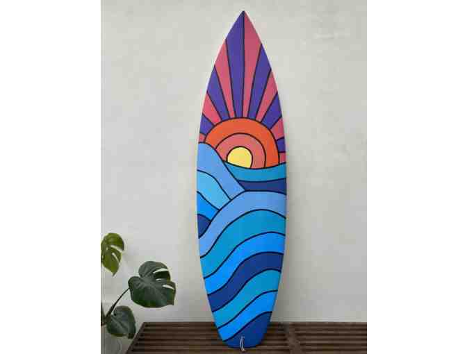 You will want to display this beautiful hand painted 5'6" fiberglass shortboard surfboard in yor home! The backside is unpainted, so this was designed to be against a wall and admired.
