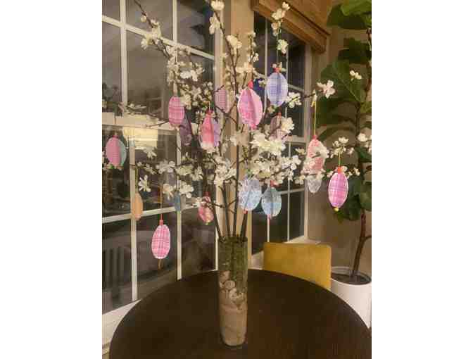 Class presents a large springtime centerpiece with paper egg ornaments each handmade by students. It arranged with spring foliage in a glass vase. Perfect for a festive dining table or entryway!