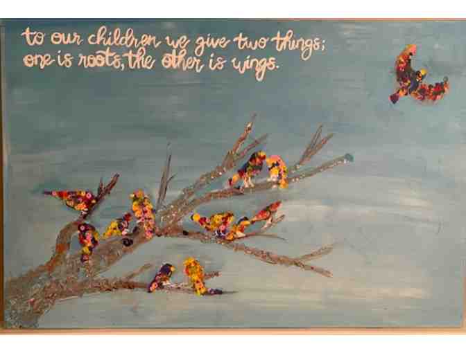This 2 feet by 3 feet wrapped canvas was finger painted in acrylic paint by 2 and 3 years olds in the Treehouse room. It was important to them to use all the colors of the rainbow to represent every bird song they hear. Some colors are fast and some colors are loud or soft according to them. On the top of the painting it says, “to our children we give two things; one is roots, the other is wings.”. Such a beautiful piece of art to remember this time in your child's life!