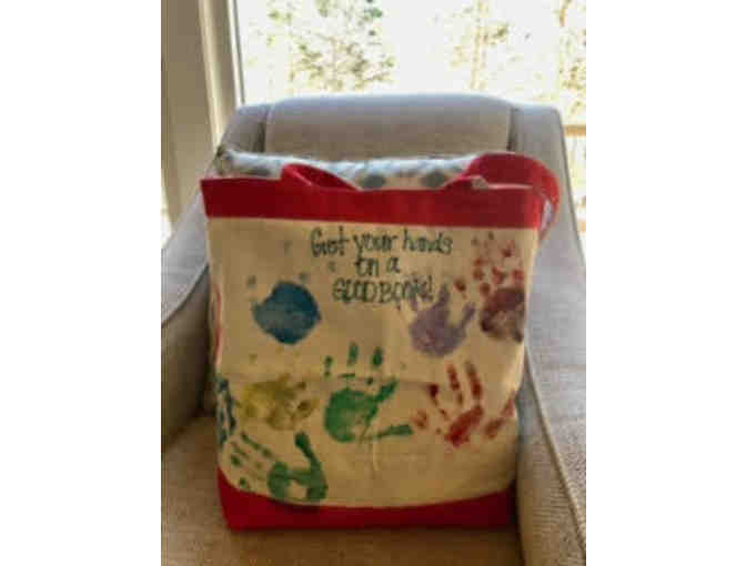 Everyone needs a library book tote bag to use with your little one for checking out and returning books at the library. It has the Tu/Th Treehouse 2s class handprints on it as a special memory from the year!