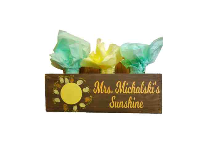 This wooden box has been lovingly transformed to a "Ray of Sunshine" thanks to Ms. Lucido's student's "sunny" thumbprints! This collector's item has countless uses including a planter, desk organizer, or utensil holder - and will always bring back memories of First Grade!