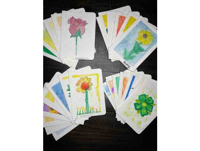 A unique set of 27 hand painted watercolor floral designs, one design from every student in Sra. Palacios 4/5th grade combo. The set includes 27 envelopes, as well as several greetings adhesives, and a keepsake Kraft box.