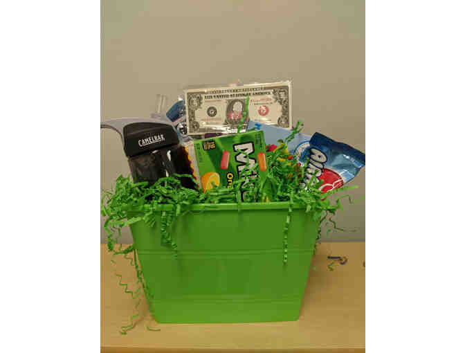 Basket includes: $25 gift card to Chuck E Cheese, $5 to Rick's frozen custard, puzzle, Camelbak H2O bottle, backpack & snacks