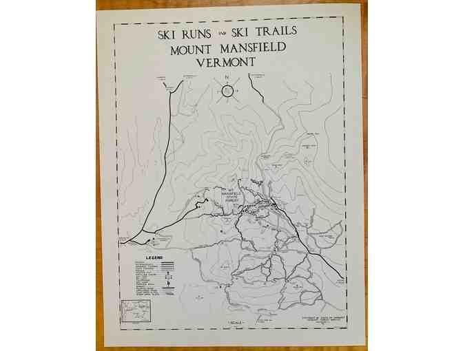 Vintage 1941 map "Ski Runs & Ski Trails Mount Mansfield Vermont" produced by State of Vermont Forest Service. Includes trails on Stowe and Underhill sides of Mt. Mansfield, Ranch Valley, and Trapp's.