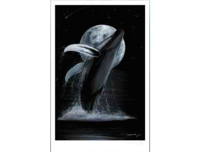 A moon rise iluminates a breaching humpback whale in this powerful original painting by marine life artist Wyland. Wyland encountered this scene on a still evening as his small boat drifted silently over calm waters. "We were amazed when a forty-ton humpback whale suddenly hefted its entire body towards the heavens," he says. "It seemed to hang there frozen in time. I wanted to hold that moment forever. Lunar Celebration is my way of capturing the ingredible power and grace these acrobatic leviathans."