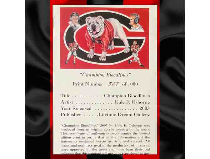 "Champion Bloodlines" 2003 by Gale F. Osborne was producedd from an original acrylic painting by the artist. This certificate of authenticity accompanies the limited edition print to certify that all the information and the statements contained herein are true and correct. All plates and negatives used in the production of this print were approved by the artist and have been destroyed ensuring that this painting will never by reproduced in any other fine art form.