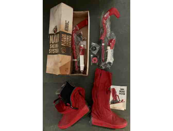 The Italian Nava Ski System is one of the more unusual boot and binding systems launched in the past 35 years. It consists of a soft, warm, waterproof knee-high mukluk with an aggressive snow-walking tread. Hidden in the sole was a stainless steel lug that mated to a release binding on the ski; to provide edging power a spring-loaded lever arm was hinged to the back of the binding.
