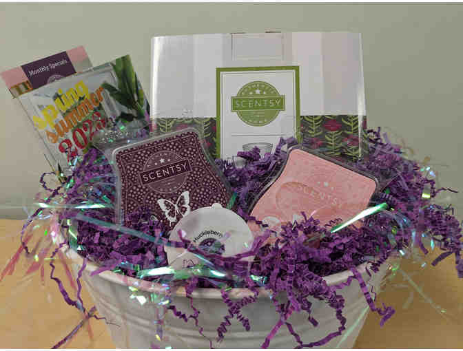 Basket includes Alabaster warmer, strawberry lemoncake, black raspberry vanilla, huckleberry hideaway