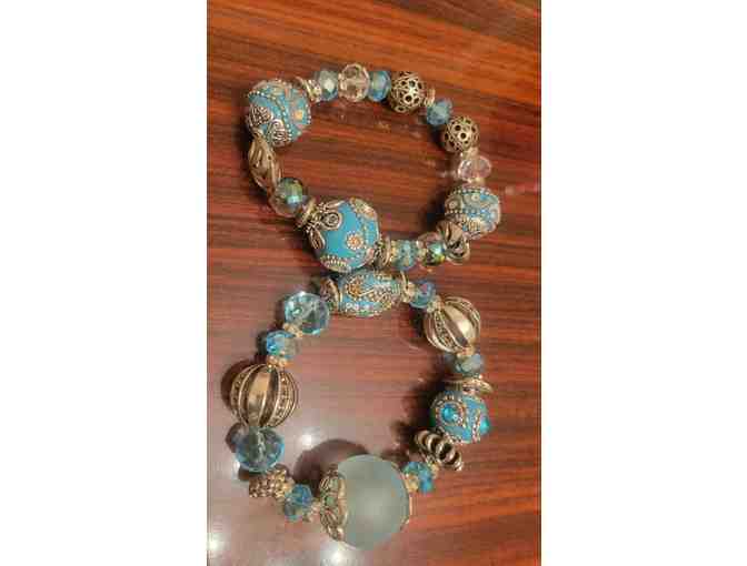 These two chunky baby blue and gold beaded bracelets are not only beautiful but full of rich color. They are sophisticated, yet perfect for everyday wear, but they will also add flair to any outfit to make any evening truly unforgettable! Handmade with love by Big Sunday's special friend Kendis Wilbourne.