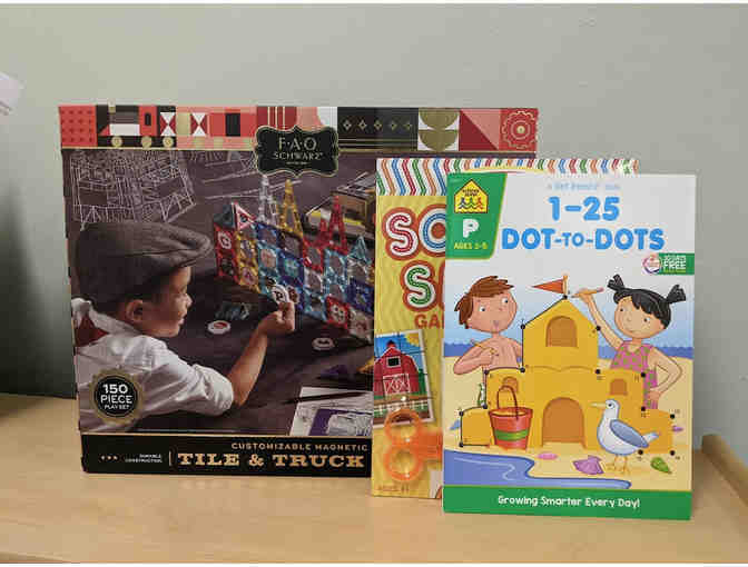 Items included: Magnetic Tile and Truck Contruction Play Set, $5 Rick's frozen custard gift card, snacks and scissor skill book/dot to dot activity book
