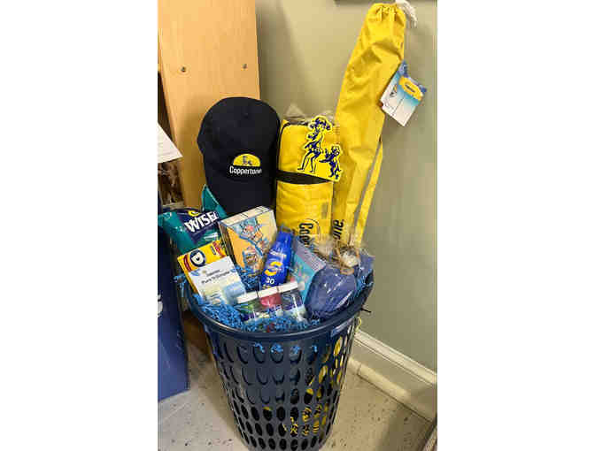 Basket includes Coppertone beach chair, umbrella, sand mat, blow up float, tee shirts (Medium, Large, X-Large), sun tan spray, Pure & Simple sun protection, Coppertone hat