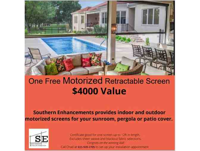 Gift certificate for one motorized retractable screen (up to 12 ft in length) by Southern Enhancements!! Southern Enhancements provides indoor and outdoor motorized screens for your sunroom, pergola, or patio cover.