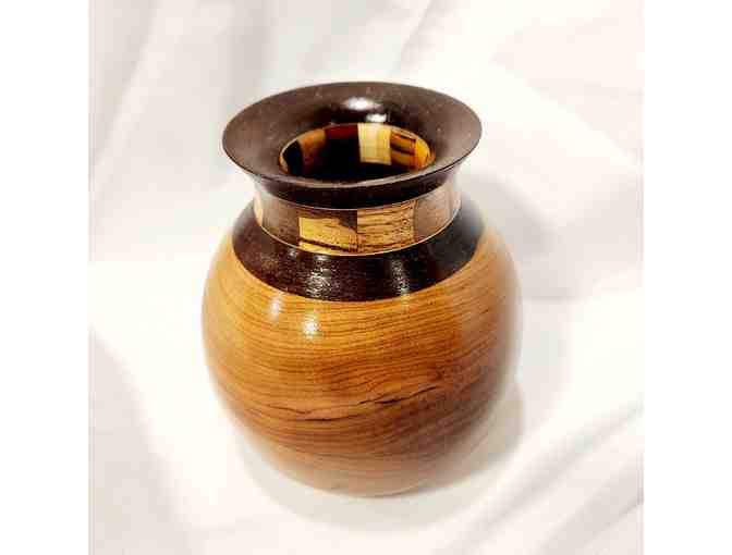 5 inch tall handmade wooden vase. One of a kind collectible. 15 different types of wood used (listed on bottom of vase)