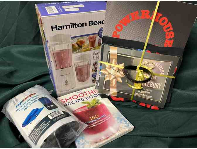 Get Fit with this Package that Includes a Hamilton Beach Personal Travel Blender, Smoothie Recipe Book, 2 Microfiber Towels and a 3 Month Membership to Powerhouse Gym in Middlebury, CT with Powerhouse Branded Merchandise.