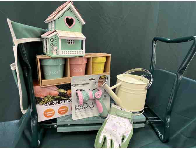 This Gardening Package Includes a Home & Garden Foldable Kneeler & Seat, a Watering Can, a Garden Tool Set, 3 Small Potting Plants, a Bird House, a Hose Spray Nozzle, and Gardening Gloves.