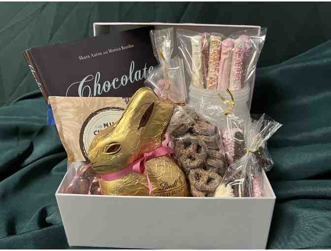 This package includes the Book "Chocolate -- A Healthy Passion" signed by author Shara Aaron, 7oz. Lindt Milk Chocolate Gold Bunny, Milk Chocolate Covered Almonds, Homemade Strawberry Chocolate Covered Pretzels, Homemade Semi-Sweet Chocolate Covered Pretzels, a Frosted Glass Mason Jar with a Floral Heart Design Filled with White and Strawberry Chocolate Covered Pretzel Rods with Gold and White Sprinkles, and 4 White and Strawberry Chocolate Covered Oreos.