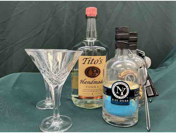 This Package Includes 2 Crystal Martini Glasses, a Handle of Titos, an "On The Beach" Cocktail Mixer, and a "Blue Dream" Cocktail Mixer.