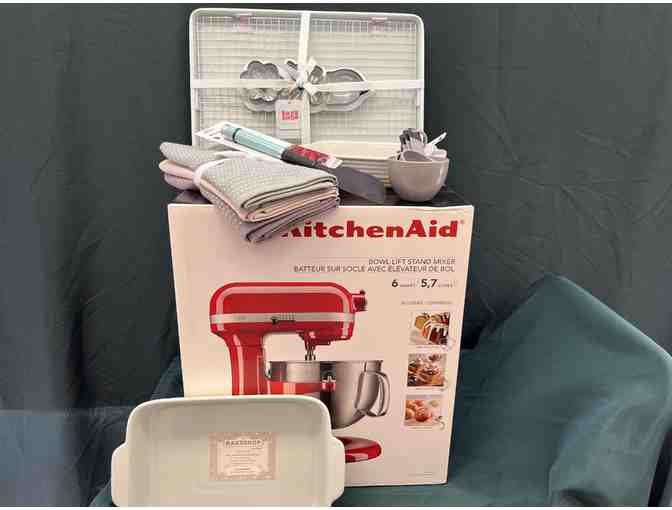 This Package Includes a KitchenAid Mixer, (1) 11X17 Baking pan, (1) 13X9 Baking Pan, Measuring Cups, Spatulas. & Dish Towels