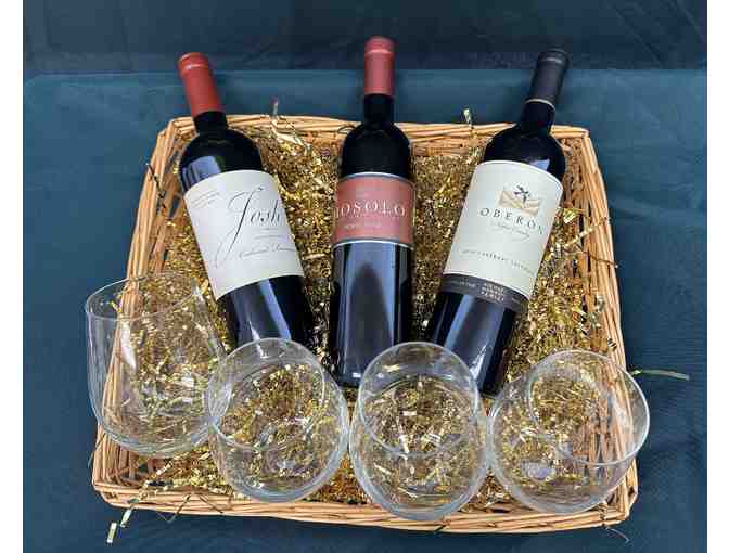 This Package Contains a Bottle of Oberon Cabernet Wine, a Bottle Josh Cabernet, a bottle of Masolo Pinot Noir and 4 Stemless Wine Glasses