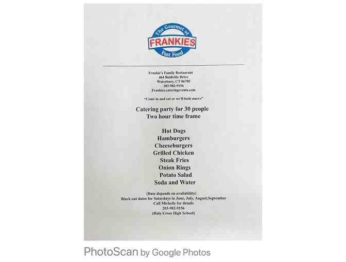 This Package Includes a Catering Party for 30 People from Frankies. This Two Hour Time Frame Offers Hot Dogs, Hamburgers, Cheeseburgers, Grilled Chicken, Steak Fries, Onion Rings, Potato Salad, Soda, and Water.