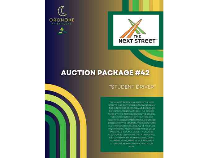 The Highest Bidder will receive the Next Street's Full Driver's Education Program. This is the most advanced and thorough driver's ed course available. The course takes 8 weeks to finish during the school year. In the summer months, there are two-week accelerated options. Insurance discounts up to 40% until you are 25 years old. This course includes all of the state requirements, including the Parent Class and Drug & Alcohol Class. This course also covers everything that a driver will encounter on the road including laws, markings, signs, maneuvers, emergency situations, highway driving and much more.