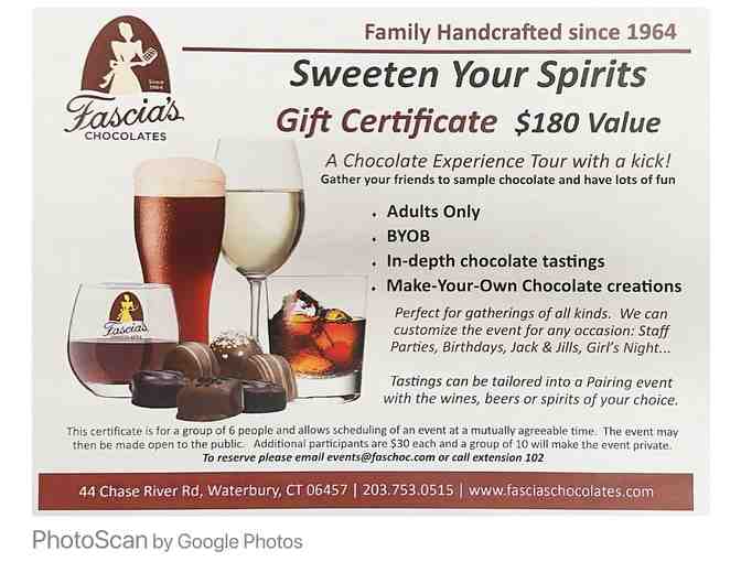 This Chocolate Experience Tour (with a kick) Allows for 6 Adults (21+) to Enjoy an In-Depth Chocolate Tasting and Make-Your-Own Chocolate Creations with BYOB at Fascia's Chocolates in Waterbury, CT. Can be Tailored Into a Pairing Event with the Wines, Beers, and Spirits of Your Choice.