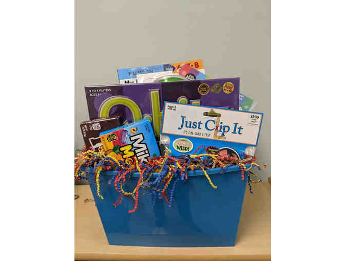 $10 Sweet Frog gift card, $10 Chick Fil A gift card, backpack, QBitz game, Just Clip It, activity book, crystal creation craft, assorted snacks