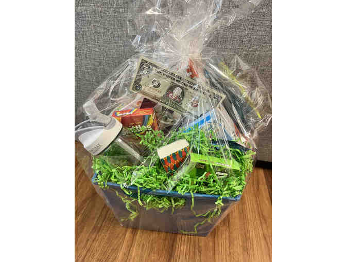 Basket includes: $25 gift card to Chuck E Cheese, $5 to Rick's frozen custard, puzzle, Camelbak H2O bottle, backpack & snacks