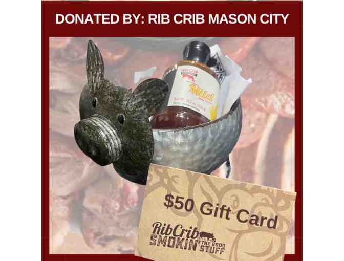 Graciously donated by RibCrib BBQ & Grill - Mason City, IA, this basket includes a unique metal pig that can be used decoratively in many ways! It also includes a bottle of Rib Crib BBQ sauce and a $50 gift card for Rib Crib.