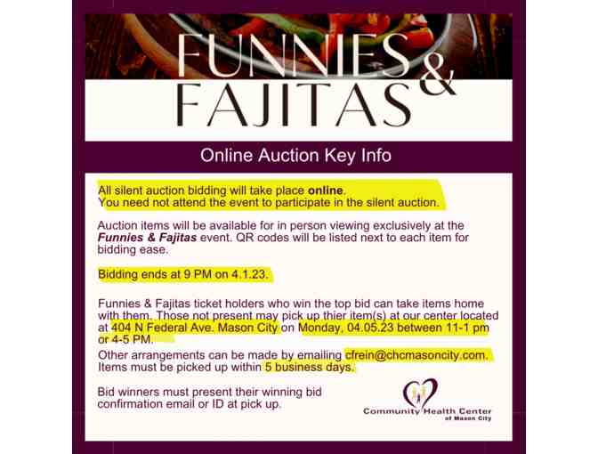 The winning bid will go to FrontStream Global Fund (tax ID 26-3265577), a 501c3 nonprofit organization, which will send the donation to Community Health Center (tax ID 200597324) on behalf of the winner.