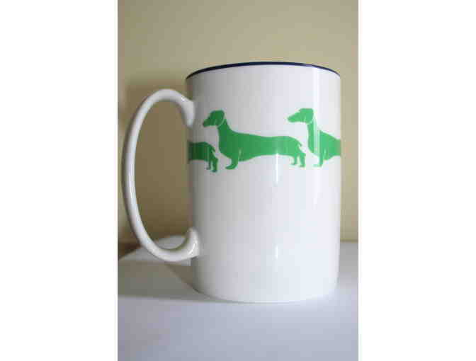 Kate Spade 10 oz. coffee mug with adorable little dachshunds encircling it. The mug is white with kelly green dachshunds and one navy blue dachshund. An adorable addition to your morning coffee routine at the office or at home!