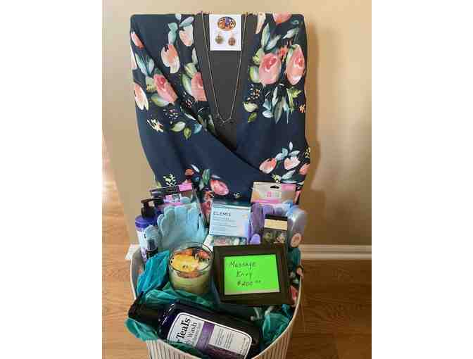 $200 massage GC, floral robe, Ellen Tracey perfume, Dr. Teal lotion and bath oil, star necklace & earrings, facial masks, bath mitt, bath brush