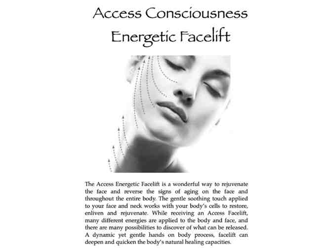 The Access Energetic Facelift is a wonderful way to rejuvenate the face and reverse the signs of aging on the face and throughout the entire body. The gentle soothing touch applied to your face and neck works with your body’s cells to restore, enliven and rejuvenate. While receiving an Access Facelift, many different energies are applied to the body and face, and there are many possibilities to discover of what can be released. A dynamic yet gentle hands on body process, facelift can deepen and quicken the body’s natural healing capacities.